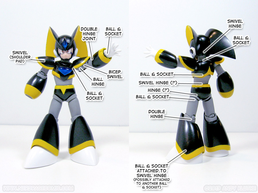 Bass’s shoulder pads disguise a more traditional shoulder configuration: an inset ball and socket in the chest, attached to a ball-hinge with bicep swivel. It’s a little disconcerting pulling Bass out of the box and feeling how loose the shoulder pads are. No, they’re not broken, he’s just designed that way. They clip into dimples on the ball-hinge so that the armor moves with the arm. Be careful not to lose ‘em, they pop off if you move the arms out shoulder pad’s allowable range.