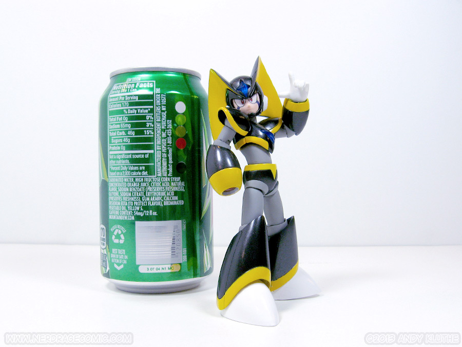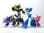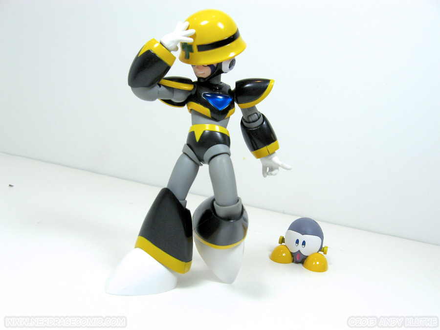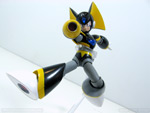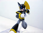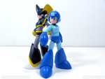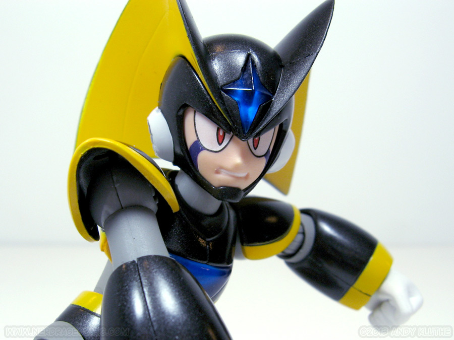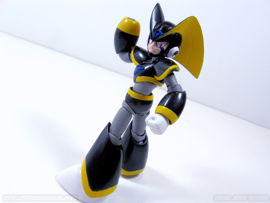 The sculpt looks good ‘n accurate, taller than Mega Man, shorter than X. His black armor is a nice glossy, almost metallic-y black (similar to X and Zero), with glossy yellow trim. The gray is a nice flat matte. The inside of his ear-cuffs, bottoms of his feet, and tip of his busters have those transparent-red jewels, backed with silver paint. His chest and forehead have blue jewels. My only complaint with the paint job is that it’s almost impossible to perfectly cover black with a coat of yellow (Period. Not specifically with this figure) so if you inspect him closely, some of the yellow has slightly different shades where it was applied thicker/thinner. This isn’t a huge issue and definitely not something that will be noticeable from a normal viewing distance – and it’s definitely better than the alternative option of casting him in yellow plastic and worrying about the black scratching.