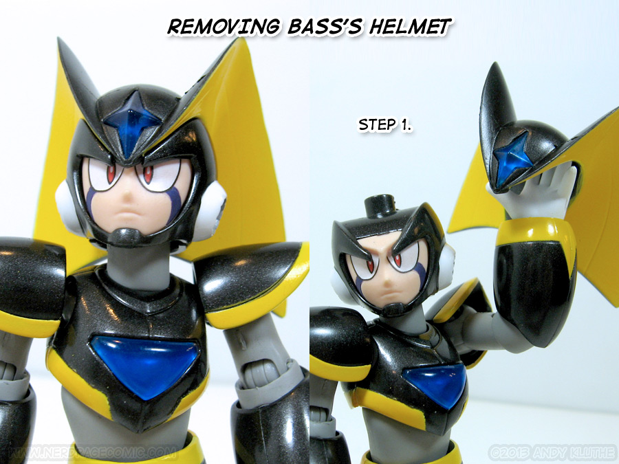 There’s three face plates, one of which has him looking down/to the side. Finally! These Mega Man characters have such big eyes, it’s a shame they’ve all been focused straight forward until now. The other face plates represent the remaining spectrum of Bass’s emotions: mouth-closed angry and teeth-baring angry.