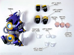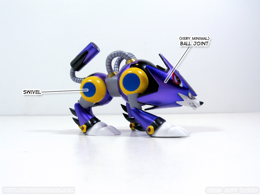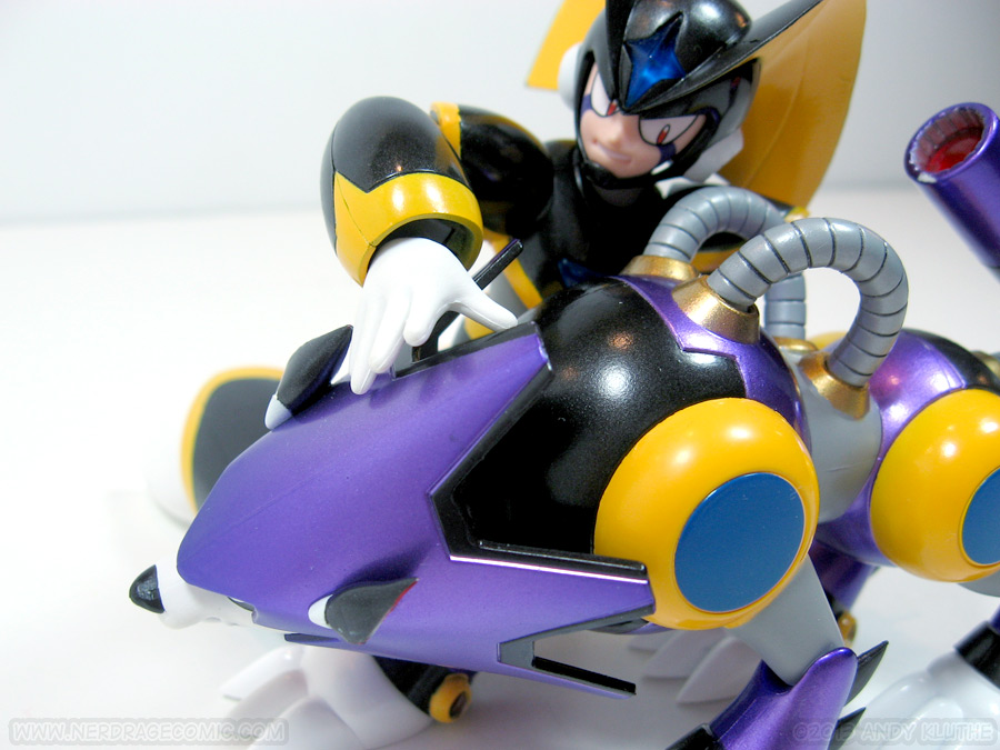 Treble’s paintjob is awesome (although mine, unfortunately, came with a chipped tail). I reiterate a lot of the budget had to have gone into this figure, just to accommodate small paint details. The majority of his color scheme is a glossy, metallic purple, with the rest being black, gray, white, and yellow like Bass. Smaller details, like his segmented tube-wires are a more metallic gray and they’re cuffed with a metallic gold. He may not do much, but he looks really nice.